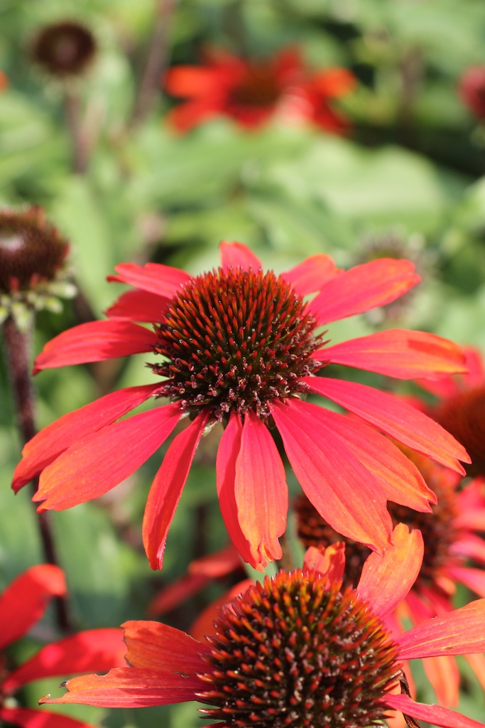 Echinacea ’Sunseekers Orange’. Varma rödorange blommor på stabila stjälkar. ’Sunseekers Orange’ blir 50 cm hög och som andra sorter i serien har den ett buskigt växtsätt och riklig blomning. I serien Sunseekers finns även färgerna röd, vit och gul. Att regelbundet plocka bort vissna blommor gynnar ny knoppsättning.