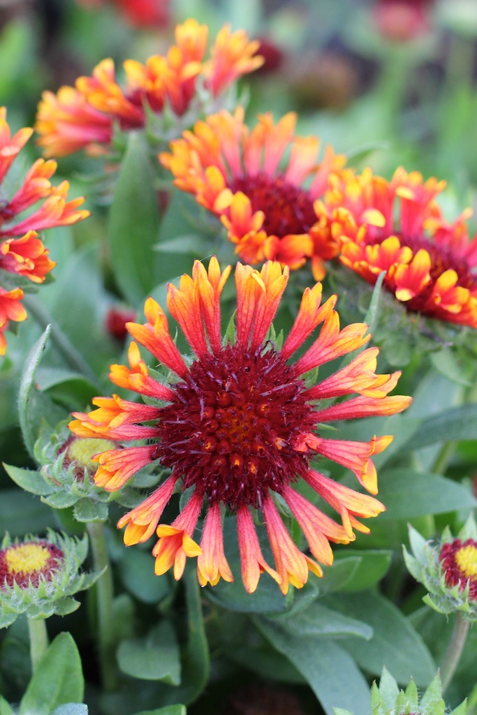 Gaillardia grandiflora ’Fanfar Blaze’. Kokardblomster. Blommor i varma brända orange toner. Värdefull för sin långa blomtid under sommaren, från juni till september. Den har ett kompakt växtsätt och blir 40 cm hög. ’Fanfar Blaze’ är en färgstark sort för rabatt och kruka. Även fina långa stammar till snitt.