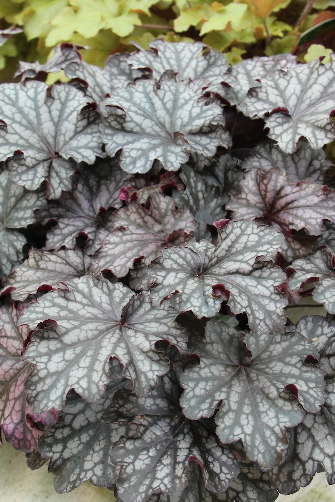 Heuchera ‘Blackberry Jam’ är en tålig och långlivad alunrot. Det finns många sorter med silvrigt bladverk men med sitt mörka svagt silverskimrande bladverk, som övergår i ett violettrosa skimmer, är detta en av de bästa. Sparsam blomning. Blir 30 cm hög och håller sin fina runda form bra.